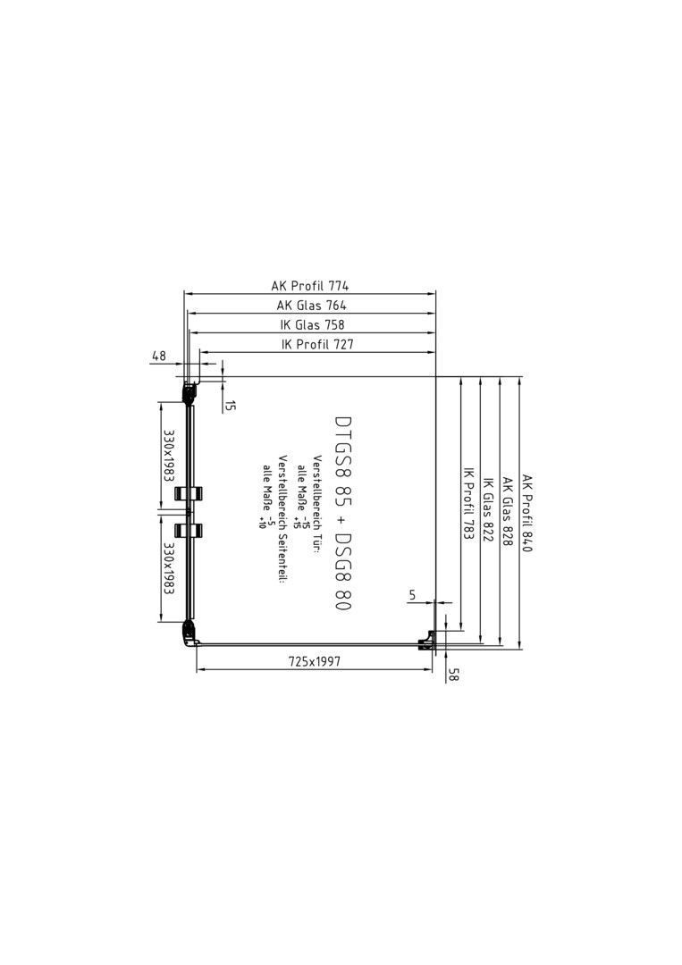 | Einbaubreite Tür für die Montage mit Seitenwand | 835 - 865 mm |