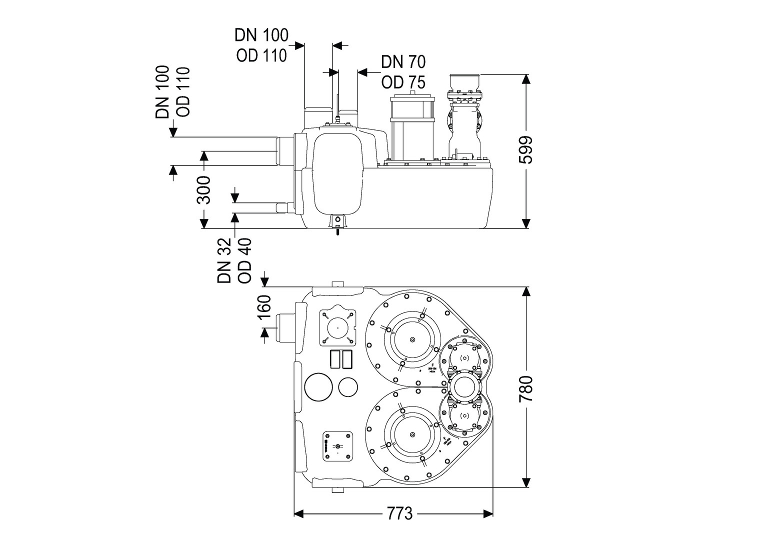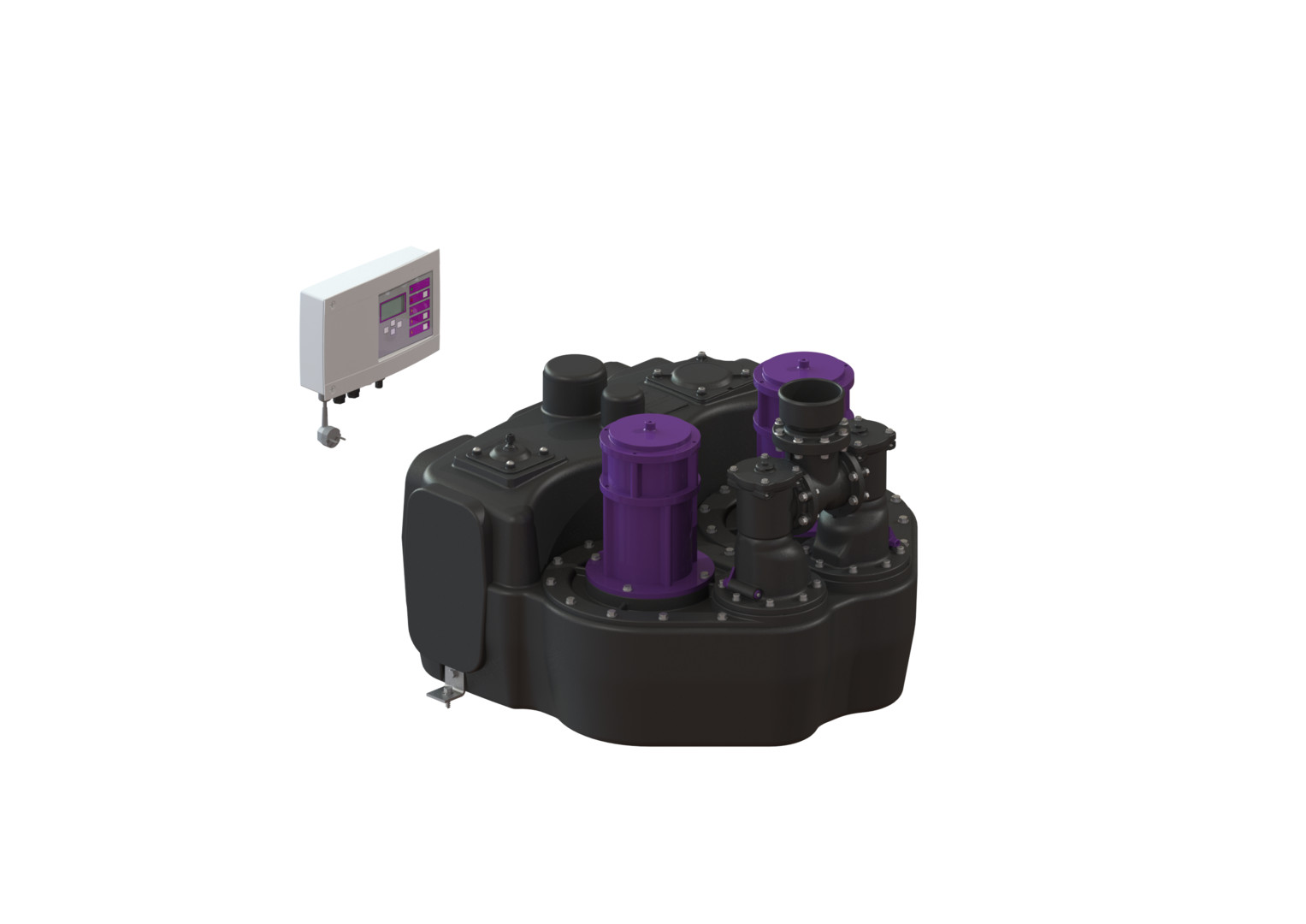 mit Comfort-Schaltgerät, Anlage mit zwei Pumpen, zur freien Aufstellung, Sammelbehälter aus PE, mit Freistromrad, Pumpen Typ SPF, Behältervolumen 120 l, max. Nutzvolumen 50 l, schalldämmender Unterlegmatte, 230 V-Versionen steckerfertig, elastische Schlauchverbindung DN 100, Druckabgang senkrecht DN 100/OD 110 ohne Absperreinrichtung, waagerecht DN 100/OD 110 mit Absperreinrichtung, Kabellänge 5 m