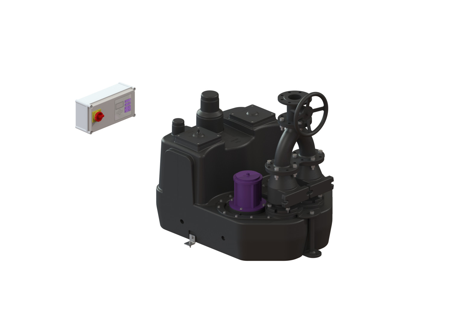 zur freien Aufstellung, Sammelbehälter aus PE, Pumpe mit Freistomrad, Pumpen Typ SPF, Behältervolumen 200 l, max. Nutzvolumen 120 l, mit schalldämmender Unterlegmatte, Comfort-Schaltgerät, eine Absperreinrichtung aus Guss (ab einer geodätischen Förderhöhe von mehr als 5 m und einem Volumenstrom von mehr als 20 cbm/h), mit Rückflussverhinderer und Druckabgang mit Flansch DN 80 nach DIN 2501, elastische Schlauchverbindung DN 100, Kabellänge 5 m