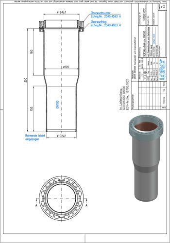 LORO Fallrohr DN 100, 350 mm, mit Überwurfmutter und Gleitscheibe