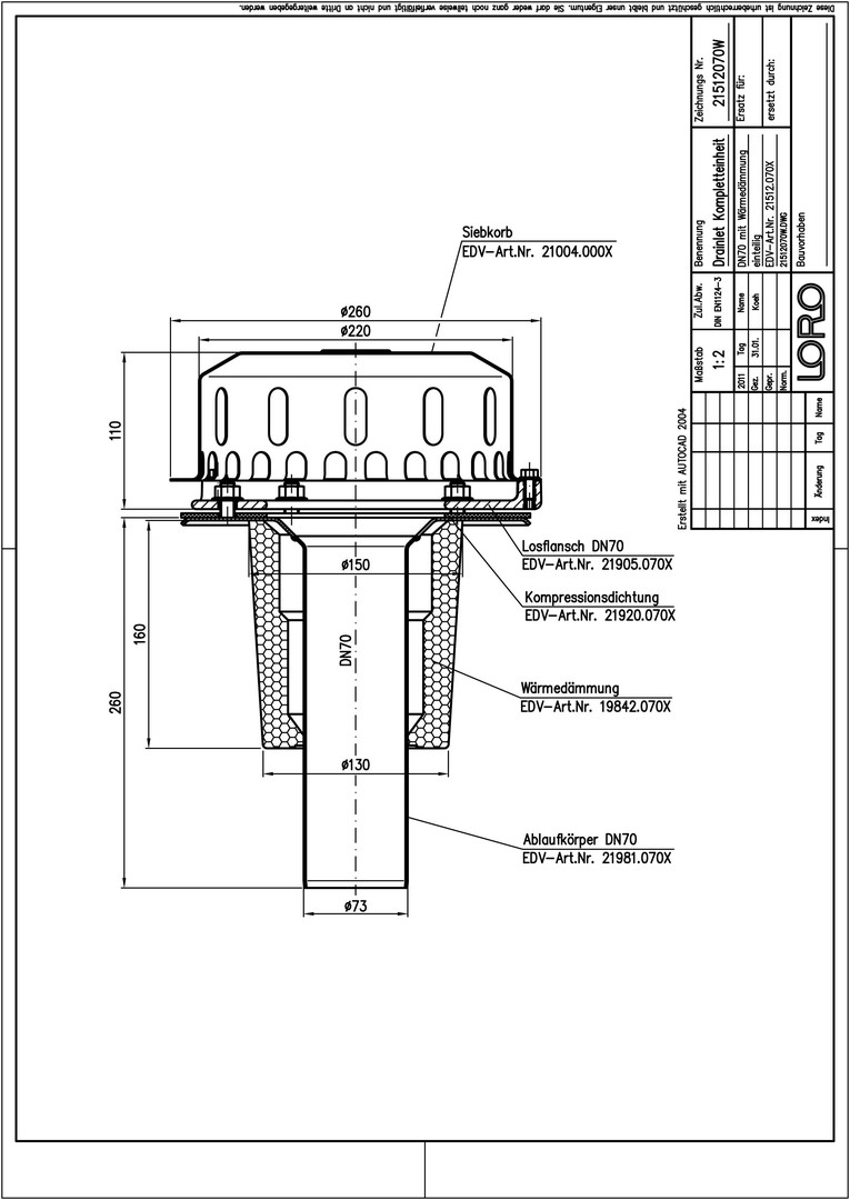 LORO DRAINLET Komplett-Flachdachablauf Serie 84 DN 70, Wärmedämmung, Klemmflansch, Auslauf senkrecht, einteilig, Hauptentwässerung