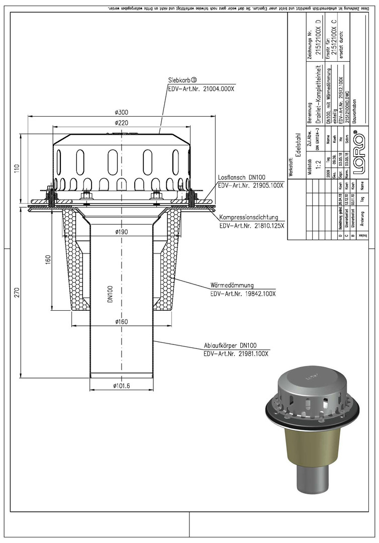 LORO DRAINLET Komplett-Flachdachablauf Serie 84 DN 100, Wärmedämmung, Klemmflansch, Auslauf senkrecht, einteilig, Hauptentwässerung