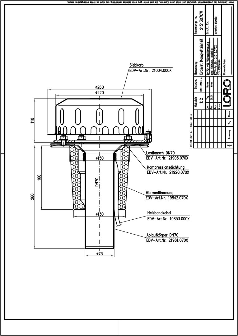 LORO DRAINLET Komplett-Flachdachablauf Serie 84 DN 70, Wärmedämmung und Heizung, Klemmflansch, Auslauf senkrecht, einteilig, Hauptentwässerung