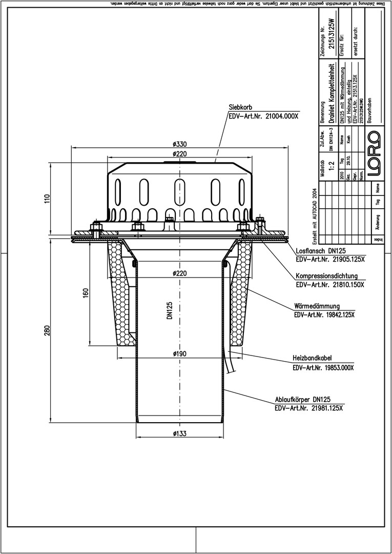 LORO DRAINLET Komplett-Flachdachablauf Serie 84 DN 125, Wärmedämmung und Heizung, Klemmflansch, Auslauf senkrecht, einteilig, Hauptentwässerung