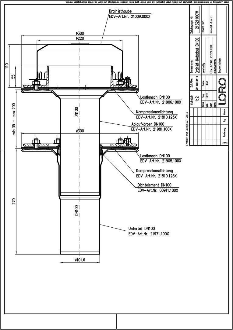 LORO DRAINJET Komplett-Schnellablauf Serie 49 DN 100, ohne Wärmedämmung, Klemmflansch, Auslauf senkrecht, zweiteilig, Notablauf