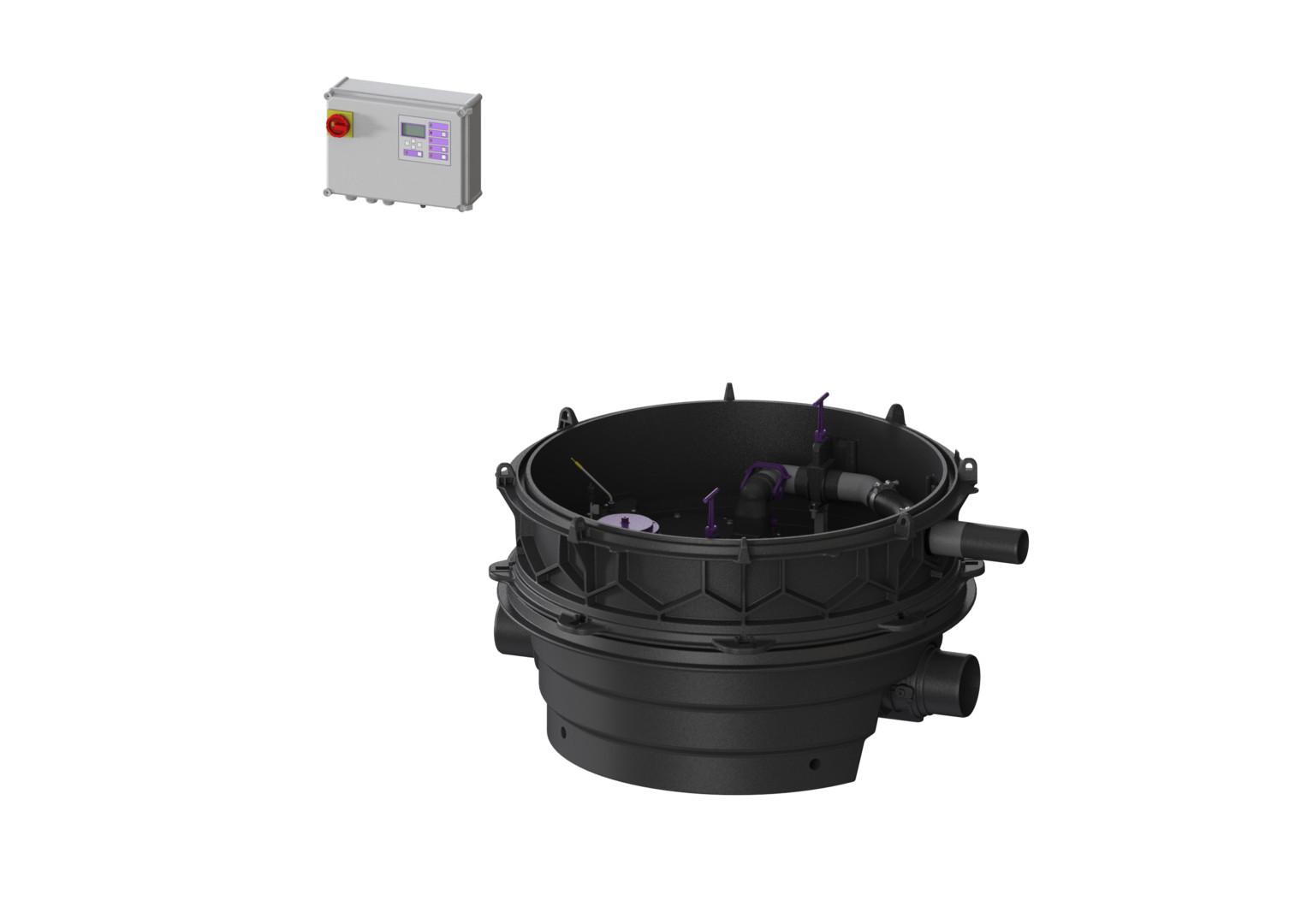 Trockenaufstellung, für fäkalienhaltiges Abwasser, Bodenteil aus PE, für Einbau in frostgeschützten Räumen (frei aufgestellt) oder in Kombination mit Technikschacht-Modul, zum Einbau ins Erdreich, beständig bei Einbau ins Grundwasser bis 3000 mm, die Druckleitung ist als geschweißtes PE-Rohr, bei Pumpe SPF 4500 zusätzlich in einem Druckentspannungsschacht auszuführen, Rückstauhebeanlage Ecolift XL Mono, Zulauf/Auslauf DN 150, mit Comfort Plus-Schaltgerät, mit einem motorischen Verschluss für Schwarzwasser, 230 V-Versionen steckerfertig, Kabellänge 10 m