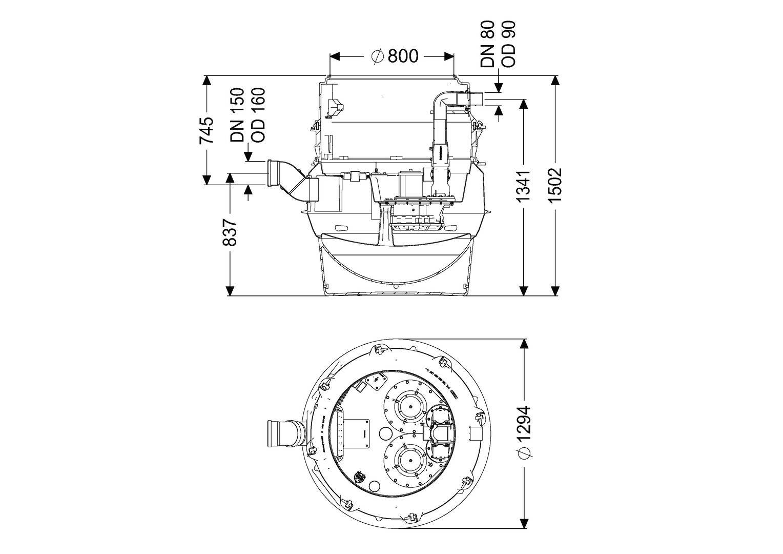 Trockenaufstellung, Variante für niedrigsten Einbau, für fäkalienhaltiges Abwasser, Bodenteil aus PE, Pumpe mit Freistromrad, Einbau in Kombination mit Aufsatzstück LW 800 zum Einbau ins Erdreich oder in eine Bodenplatte, beständig bei Einbau ins Grundwasser bis 3000 mm, die Druckleitung ist als geschweißtes PE-Rohr oder als Klemmverbindung auszuführen, mit Pumpstation Aquapump XL Duo, 230 V-Versionen steckerfertig, aufgeschweißten Konus LW 800, Behältervolumen ca. 335 l, max. Nutzvolumen ca. 160 l, Zulauf DN 150, Druckabgang DN 80, Rückflussverhinderer, Absperreinrichtungen auf Druckleitungsseite, Kabellänge 10 m