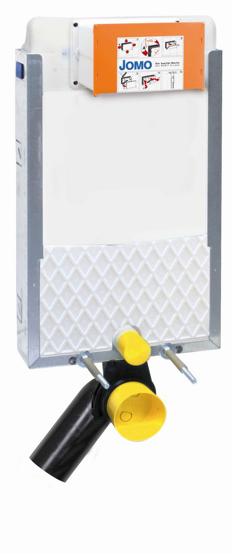 für den Einbau vor einer Wand zum Ein-und Ausmauern, bestehend aus U-förmigem, verzinktem Element, Innengarnitur mit ZMA-Technik für Start-/Stopp-Funktion und 2-Mengen-Auslösung, Bauschutz für Revisionsöffnung, Schwitzwasserisolation, Eck-Ventil 1/2", PE-Ablaufbogen DN 90/110, WC-Anschluss- Set, Befestigungsmaterial, Armaturengruppe I, geprüft nach DIN 14055, ohne Betätigungsplatte, Montageelement JOMO Light
