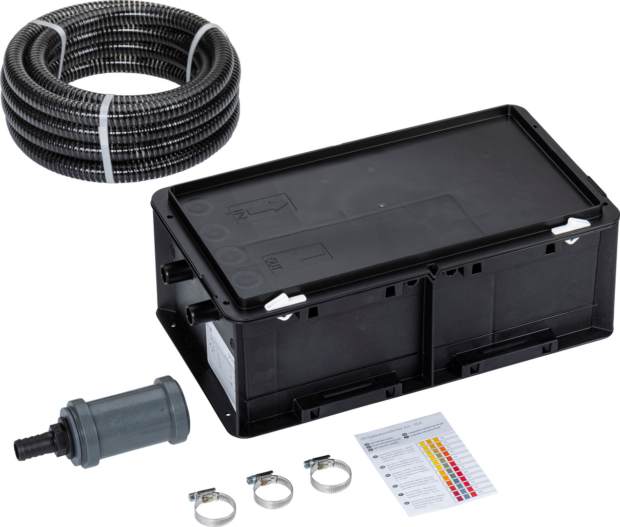 Durchlaufneutralisation für Kondensate aus Gas-Brennwertkesseln (DVGW VP 114), bestehend aus einem Neutralisationsbehälter aus Kunststoff mit integrierter Absetzzone für Verunreinigungen, pH-Indikatorstäbchen, Anschlussschlauch, Verbindungsmaterial, Erstfüllung Neutralisationsgranulat GENO-Neutralit Hz. N-210 zusätzlich mit variabler Füllmengenanpassung