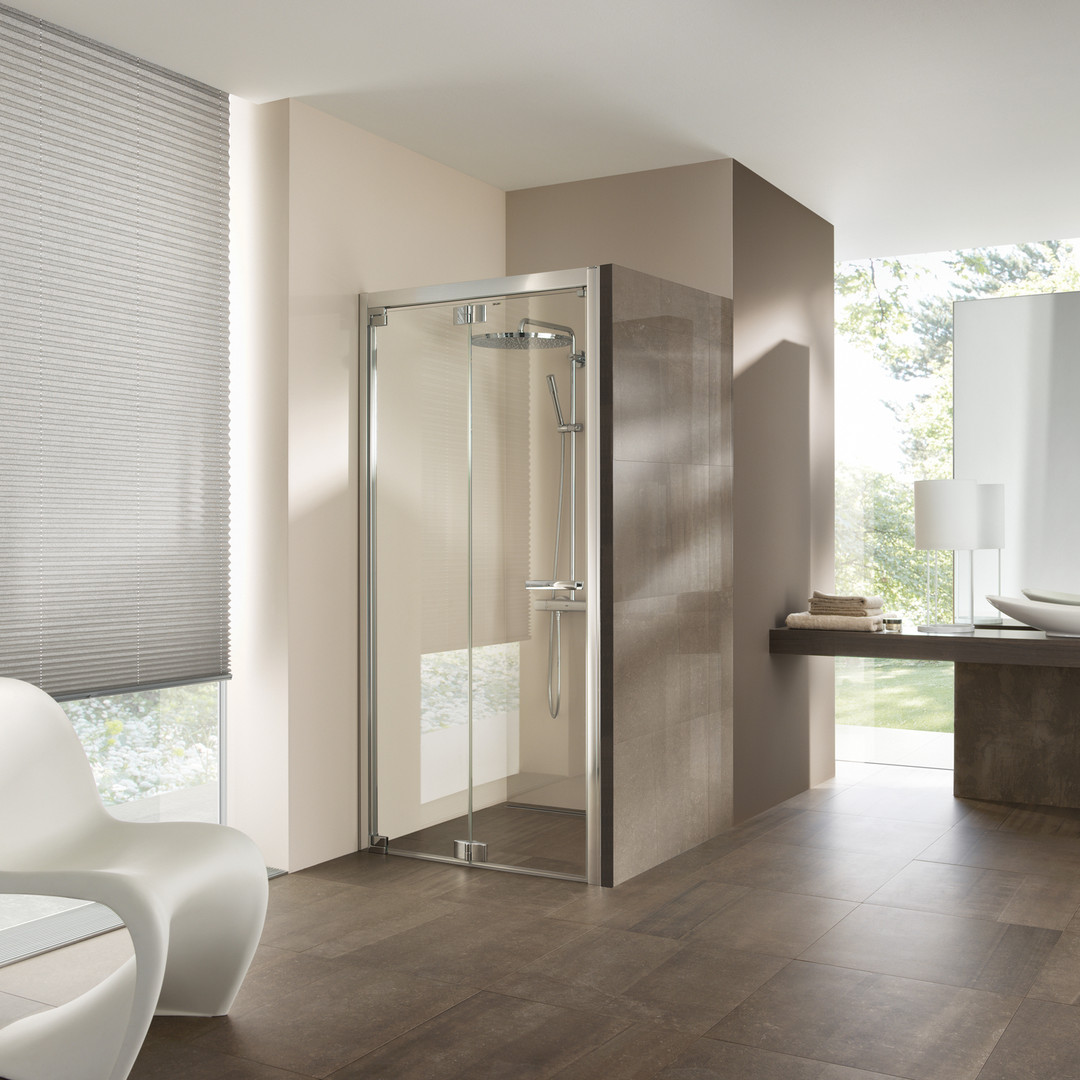 Glas 6 mm ESG transparent, Standardhöhe 2000 mm, Faltelemente 90° nach innen oder außen öffnend, optional mit Bodenleiste (Wasserschwallleiste), PALM.free, PALM.fix, PALM.lift, PALM.motion, PALM.soft, PALM.isi-clean, optional PALM.nano, PALM.care
