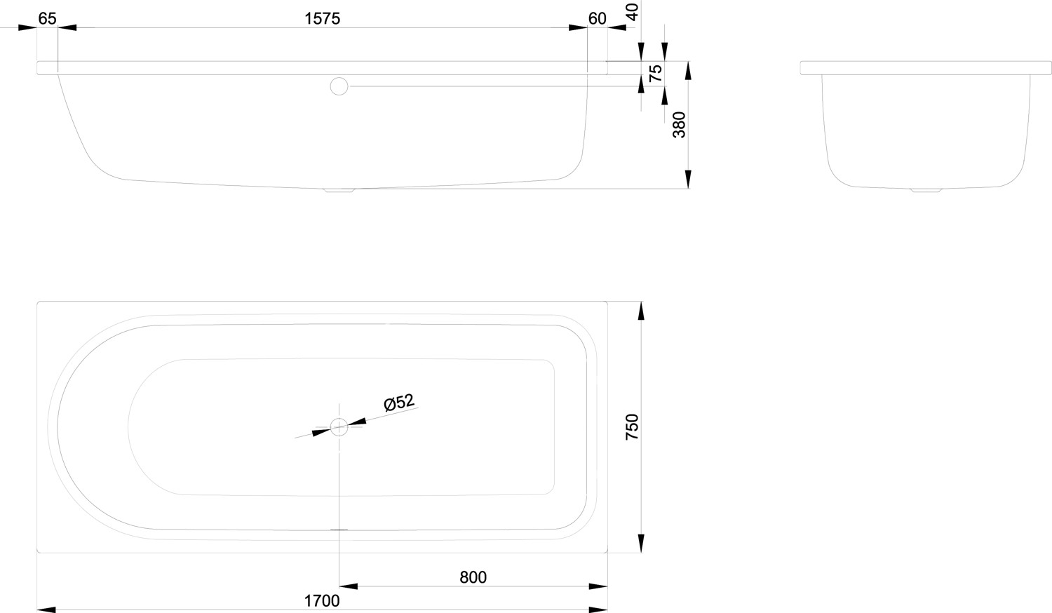 Badewanne BetteOcean Low-Line 8835 snow, 170x75x38cm, Fußende rechts, Überlauf vorne W82514