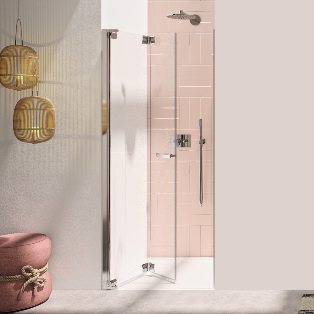 Glas 8 mm ESG, Standardhöhe 200 cm bzw. plus 3 cm Verstrebung, Wandelement 90° nach Innen und Außen, Türelement 180° nach Außen faltbar, alternativ mit 4 mm oder 15 mm hoher Schwallschiene, PALM.free, PALM.fix, PALM.lift, PALM.isi-clean, optional: PALM.nano, PALM.care, durchgehendes Wandbefestigungsprofil mit Verstellbereich