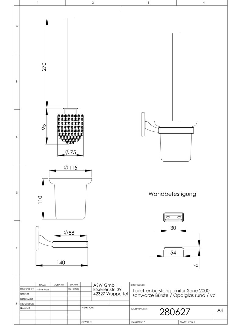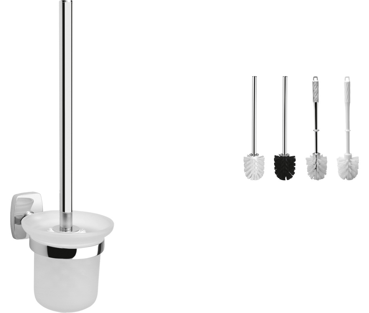 ASW Toilettenbürstengarnitur Serie 2000 Stiel MS vc/Bürste schwarz, Metallguss verchromt, Opalglas rund