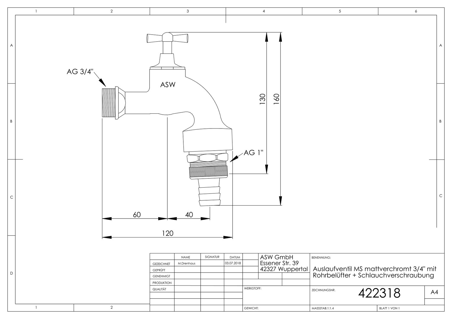 ASW Auslaufventil 3/4", Messing matt verchromt, Rohrbelüfter, Rückflussverhinderer, Schlauchverschraubung