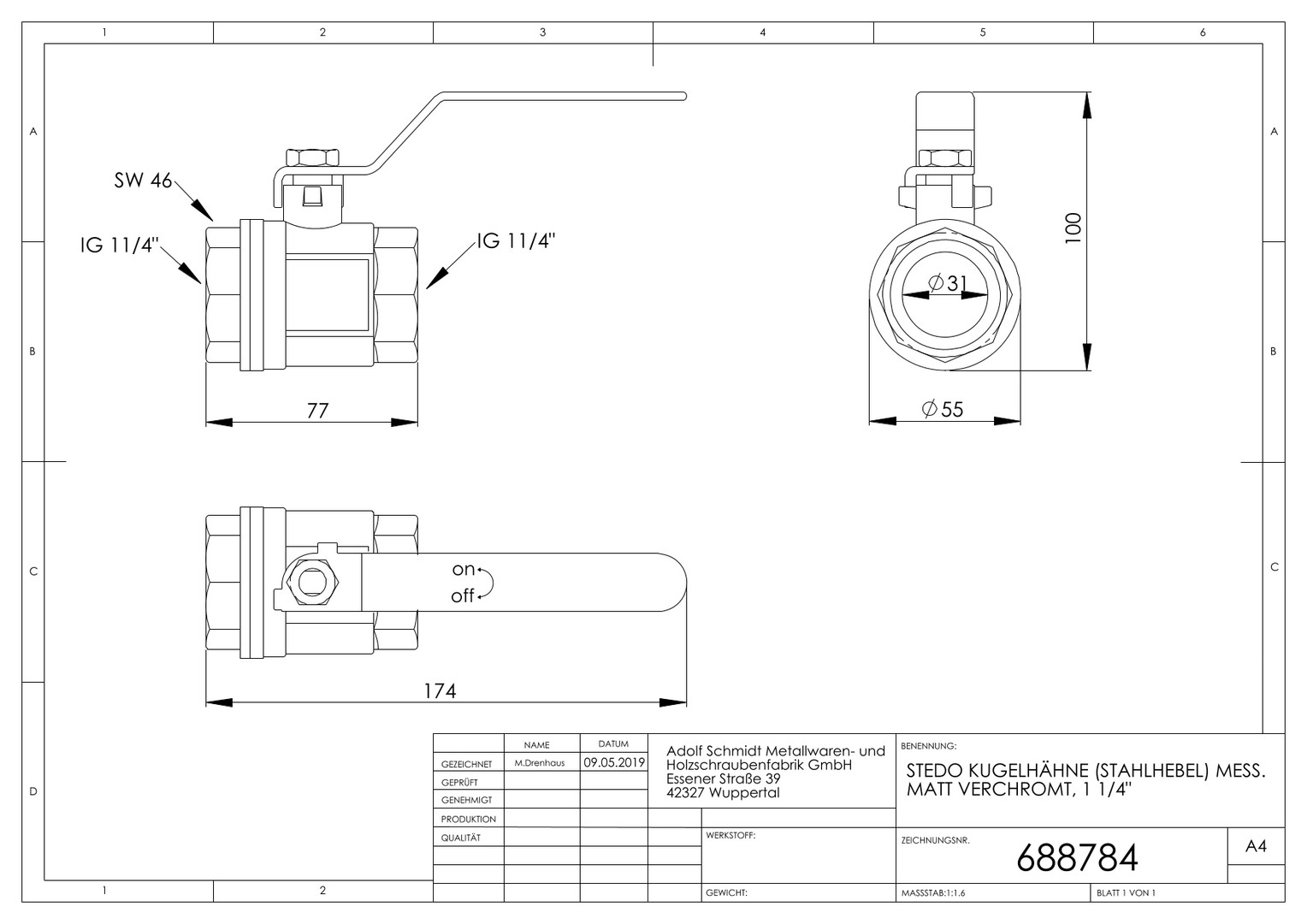 STEDO Kugelhahn Messing matt verchromt, BL 77 mm, IG 1 1/4" x IG 1 1/4"