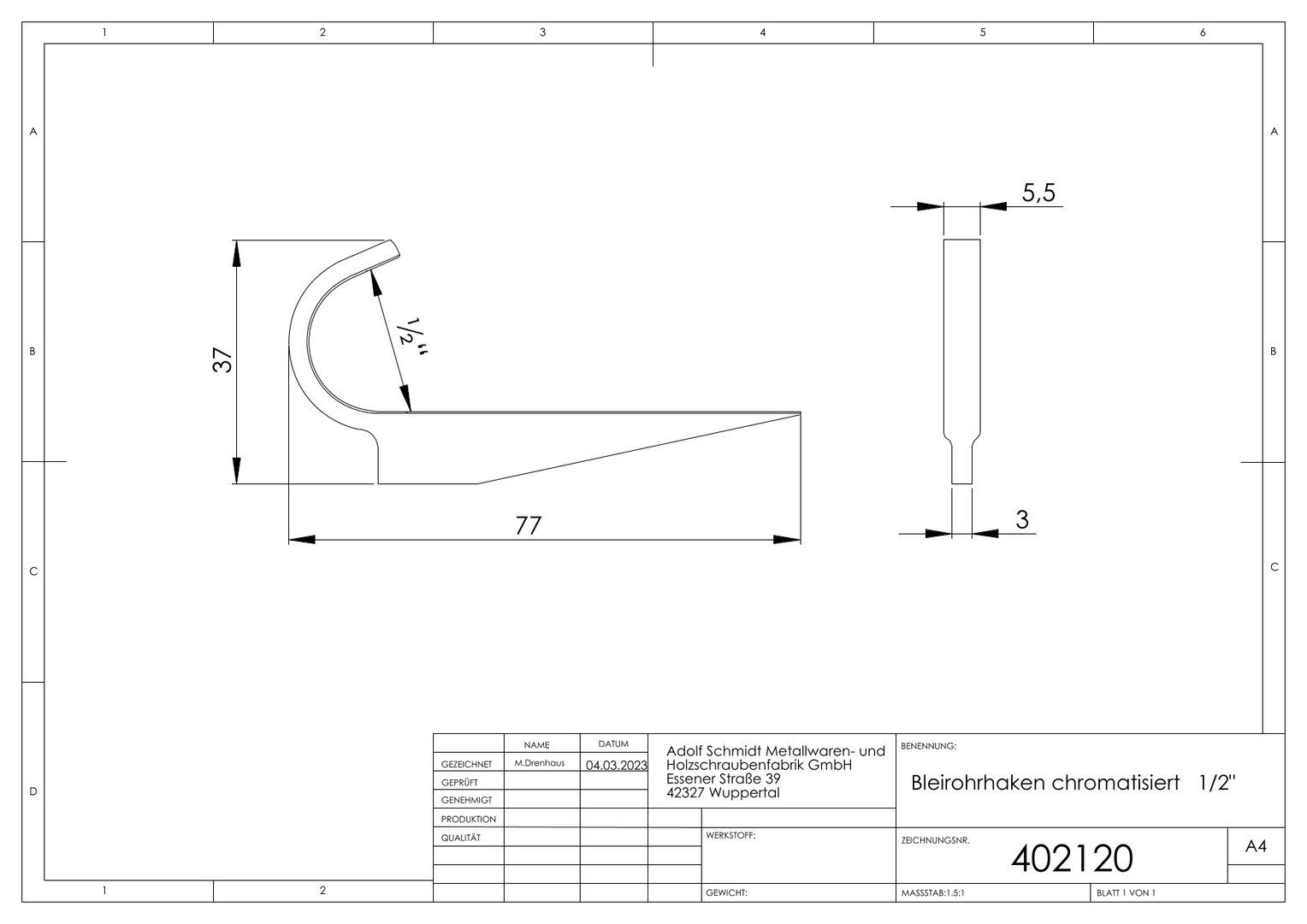 ASW Bleirohrhaken 1/2", Eisen chromatisiert, mit geschmiedetem flachen Blatt