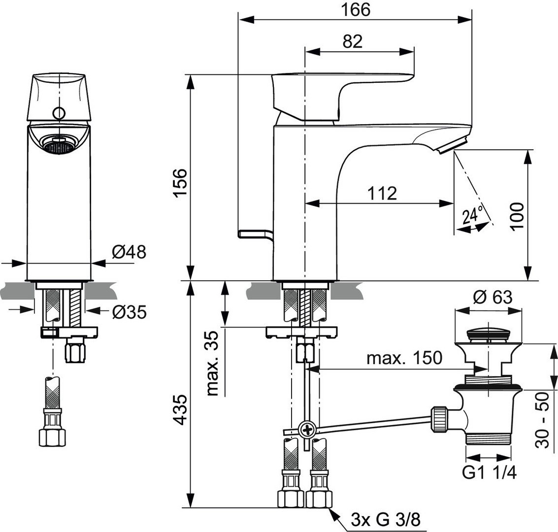DN15, Auslaufhöhe 100 mm, Luftsprudler (sichtbar), Metall-Zugstangen-Ablaufgarnitur G 1 1/4, flexible Anschlussschläuche G 3/8, Griff aus Metall mit Rot-/Blau-Markierung, Schnellmontagesystem, Kartusche Ø 38 mm, Kartusche mit keramischen Dichtscheiben, Kartuschenschwenkbereich 100°, Kartuschenübersetzung aus Edelstahl, Heißwassertemperaturbegrenzer, Norm DIN EN 248, Geräuschverhalten DIN 4109 Gruppe 1, Lebensdauer DIN EN 817, DIN EN 200