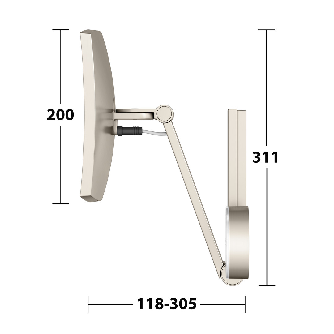 mit UP-Kabelführung, Schutzart IP 24, Wandmontage, eckig, 3-dimensionaler Gelenkarm, Spiegel einseitig, konkav, Vergrößerungsfaktor x5, Bedienung Glasbedienfeld mit kapazitiver Touch-Sensorik und LED-Anzeige, Beleuchtung 2700 Kelvin (warmweiß) bis 6500 Kelvin (tageslichtweiß), LED 7 Watt, Netzanschluss mit UP-Dose und Leerrohr erforderlich