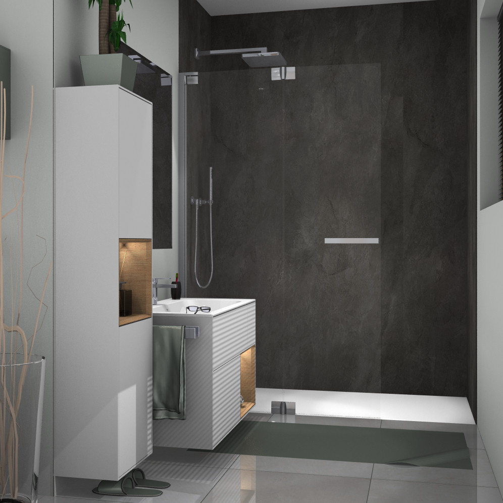 Glas 8 mm ESG, Standardhöhe 200 cm, Wandelement 90° nach Innen und Außen, Türelement 180° nach Außen faltbar, PALM.lift, PALM.free, PALM.isi-clean, optional PALM.nano, PALM.care, kein Sondergriff möglich, durchgehendes Wandbefestigungsprofil mit Verstellbereich