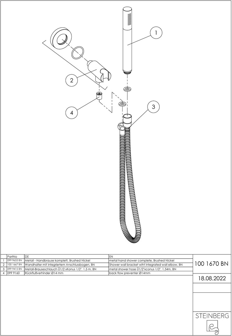 Steinberg Handbrausegarnitur Serie 100 mit Wandanschlussbogen und Brauseschlauch 1500mm, Brushed Nickel W323088