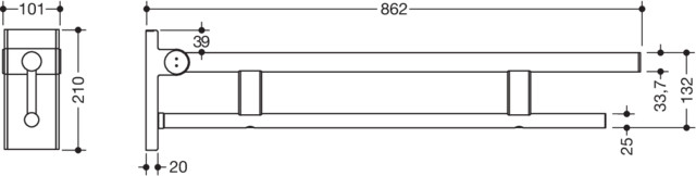 aus Edelstahl, zwei parallele, übereinander angeordnete runde Griffebenen, kann nach oben und gebremst nach unten geklappt werden, wartungsfreies, dauerhaft leichtgängiges Gelenk, voreingestellt ab Werk, ab einer 45°-Neigung senkt sich der Stützklappgriff selbstständig ab, in oberer Position (Neigung < 45°) sichert eine definierte Reibkraft den Stützklappgriff vor unbeabsichtigtem Absenken/Auslösen, definierter Anschlag verhindert, dass Stützklappgriff an die Wand stößt, höchste Produktsteifigkeit erhöht die Stabilität und erzeugt ein sicheres Greifgefühl beim Nutzer, 101 x 210 mm, Oberholm Ø 33,7 mm, Unterholm Ø 25 mm, belastbar bis 100 kg, mit Dichtelement zu Abdichtung der Befestigungspunkte