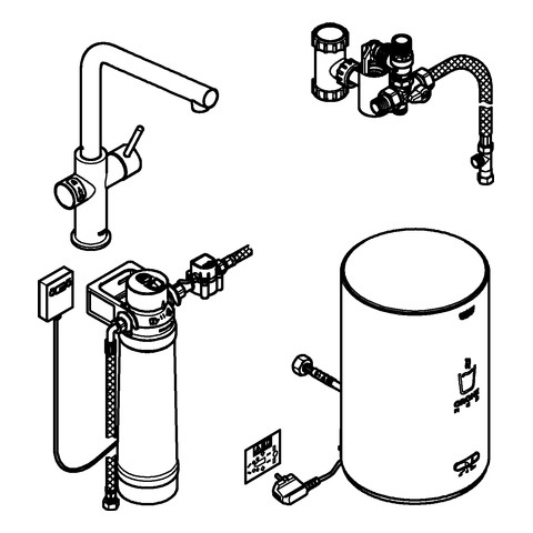 ChildLock Drucktasten für kochendes Wasser, TÜV zertifizierte elektronische Sicherung gegen versehentliches Aktivieren, Long-Life Oberfläche, SilkMove 28 mm Keramikkartusche, isolierter Rohrauslauf, Schwenkbereich 150°, getrennte Wasserwege, flexible Anschlussschläuche, Red Boiler Größe M, Hochdruckboiler für kochendes und warmes Wasser, 3 l 100 °C kochendes Wasser, 4 l Gesamtkapazität, Betriebsdruck 1-7 bar, mit flexiblem Anschlussschlauch und Abgang für kochendes Wasser, Anschlussspannung 230 V/50 Hz, Leistungsaufnahme 2100 W, Leistungsaufnahme Standby 15 W, Blue S-Size Filter Starter Set, zum Schutz des Boilers vor Verkalkung, Kapazität 600 l bei 20° dKH, Durchflussmesser