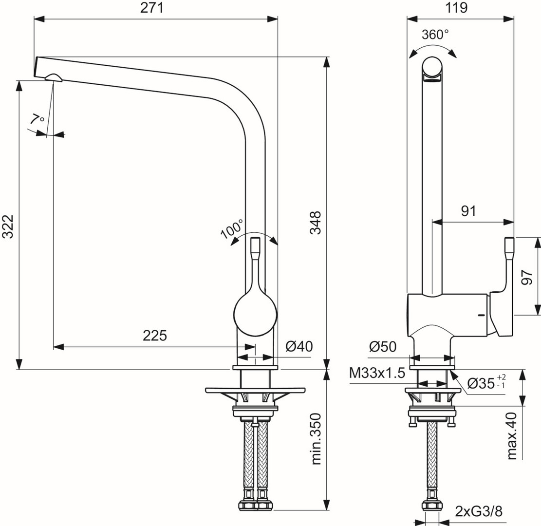 DN 15, Luftsprudler (sichtbar), Auslaufhöhe 322 mm, Griff aus Metall mit Rot-/Blau-Markierung, Schwenkbereich Auslauf 360°, Schaftverschraubung von unten, 35 mm erforderlicher Hahnlochdurchmesser, Kartusche Ø 38 mm, CLICK-Kartusche mit keramischen Dichtscheiben, Kartuschenschwenkbereich 100°, Kartuschenübersetzung aus Edelstahl. Heißwassertemperaturbegrenzer, Norm DIN EN 248, Lebensdauer DIN EN 817, DIN EN 200, Geräuschverhalten DIN 4109 Gruppe 1