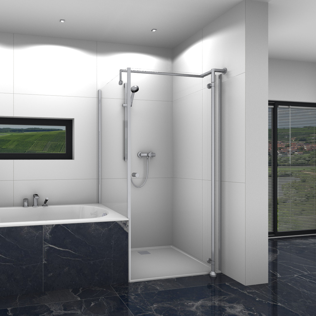 verkürzt auf Badewanne, Glas 8 mm ESG transparent, Höhe variabel bis 2000 mm, mit OUTside Pendeltüren kombinierbar, Montage auf Fliesenboden oder auf Tube Duschwanne, PALM.free, PALM.fix, PALM.pro, PALM.isi-clean, optional PALM.nano, PALME.care