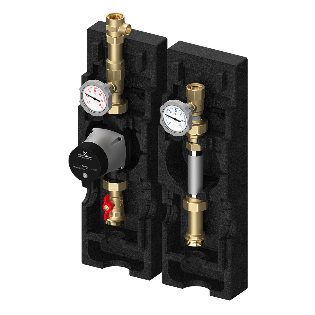komplett mit oder ohne Umwälzpumpe (EL 180 mm) mit Anschlusskabel, zwei 2-Wege-Kugelhähne (rücklaufseitig mit handaufstellbarer Schwerkraftbremse), zwei im Kugelhahngriff integrierte Kontaktthermometer (Anzeigebereich 0-120 °C), ein Pumpenkugelhahn mit Flansch, EPP-Isolierung, Achsabstand ab 175 mm frei wählbar, unterer Abgang 1 1/2" AG flachdichtend, Zählereinbaustrecke mit Teleskopstück, Fühlermuffe 1/2", Passmaß 1" 90-130 mm, oberer Abgang 1" IG