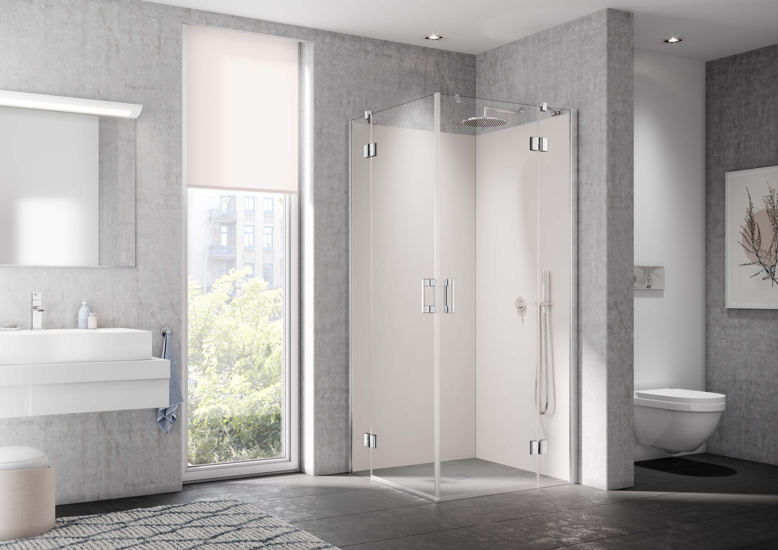 FORMAT Pro 2.0 Schwingtür-Eckeinstiegshälfte mit Festfeld silber hochglanz, 2-tlg., links, 110 x 200 cm, ESG klar