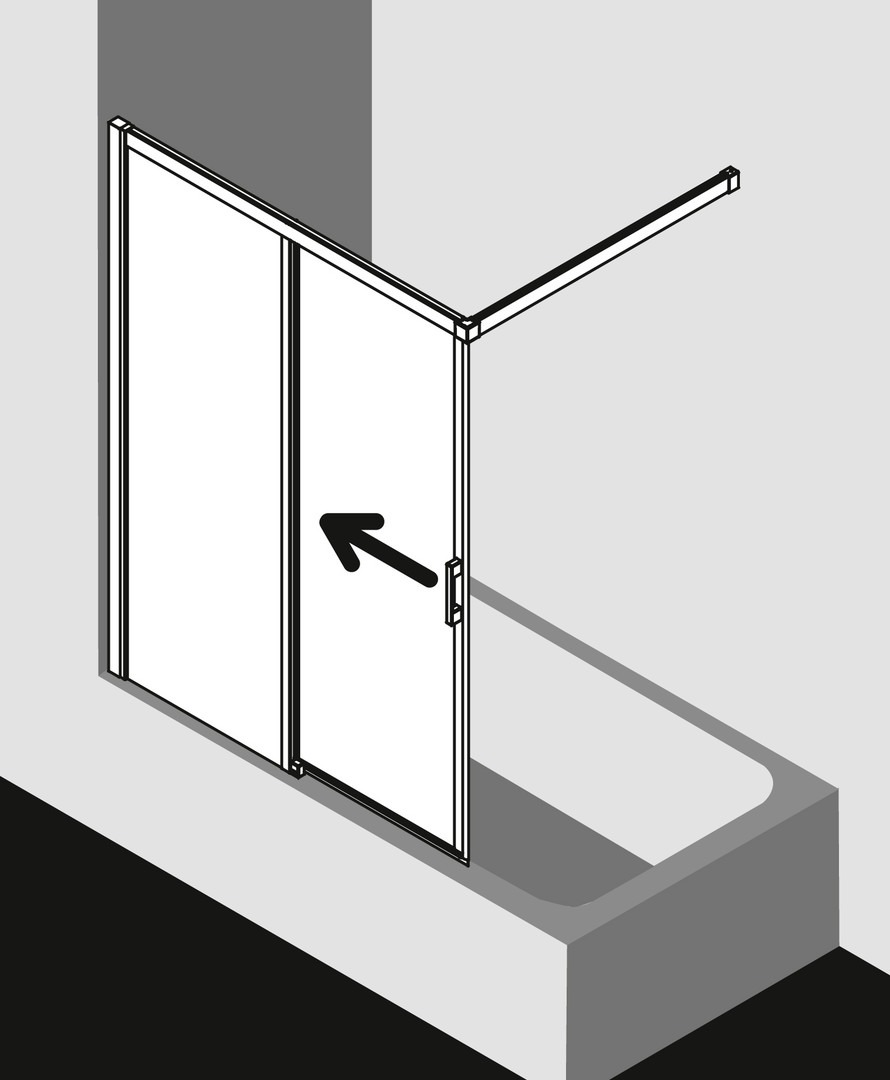 zum Einbau auf Badewanne, teilgerahmte Tür mit einem Gleittürsegment, nach einer Seite öffnend, mit Wandstütze, Verglasung mit 4 mm Einscheiben-Sicherheitsglas nach EN 12150, optional mit Pflegeleicht-Beschichtung Clean, Profile aus hochwertigem eloxiertem Aluminium, Griffe aus hochwertigem Metall, Verstellmöglichkeit im Wandprofil 25 mm, Gleittürsegment zur Reinigung nach innen schwenkbar, hochwertig kugelgelagerte Laufrollen, durchgehende Dichtprofile, waagerechte Dichtleiste mit Wasserabpralleffekt, erfüllt die Anforderung der Spritzwasserprüfung nach DIN EN 14428, mit Befestigungsmaterial
