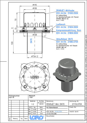 LORO DRAINJET Schnellablauf Mini-Serie 49 DN 70, einteilig, ohne Wärmedämmung, Hauptentwässerung