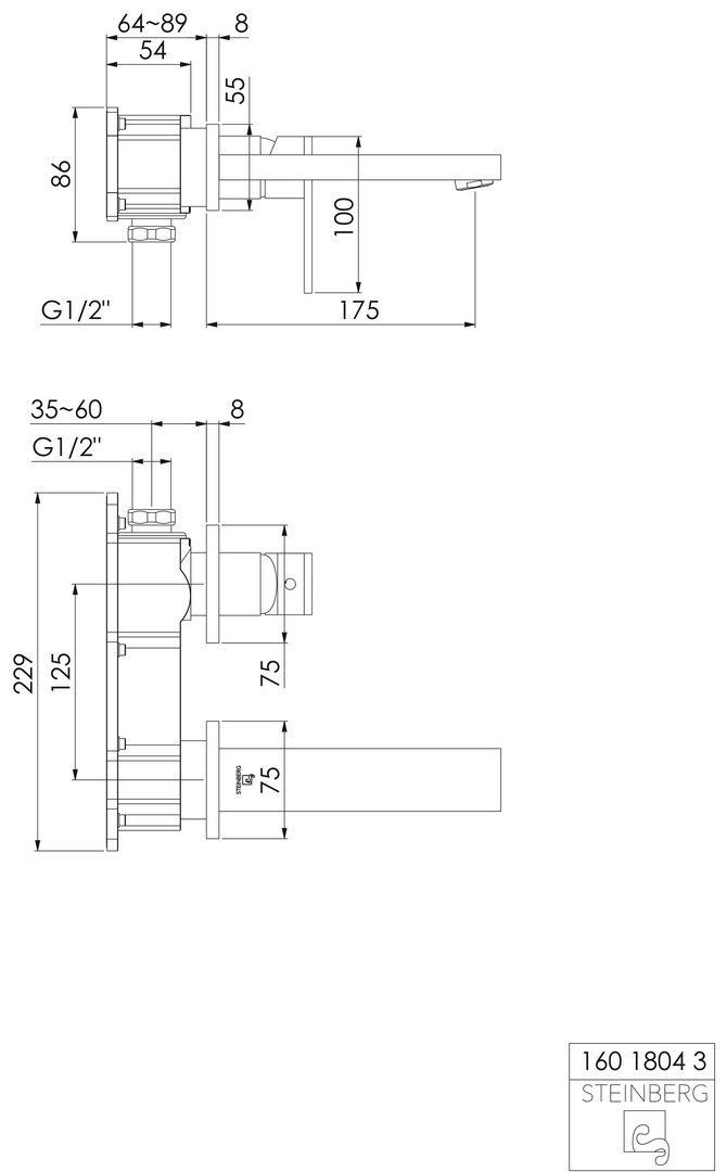 Steinberg Fertigmontageset Serie 160 Ausladung 175 mm, chrom, Waschtisch-Wand-Einhebelmischer