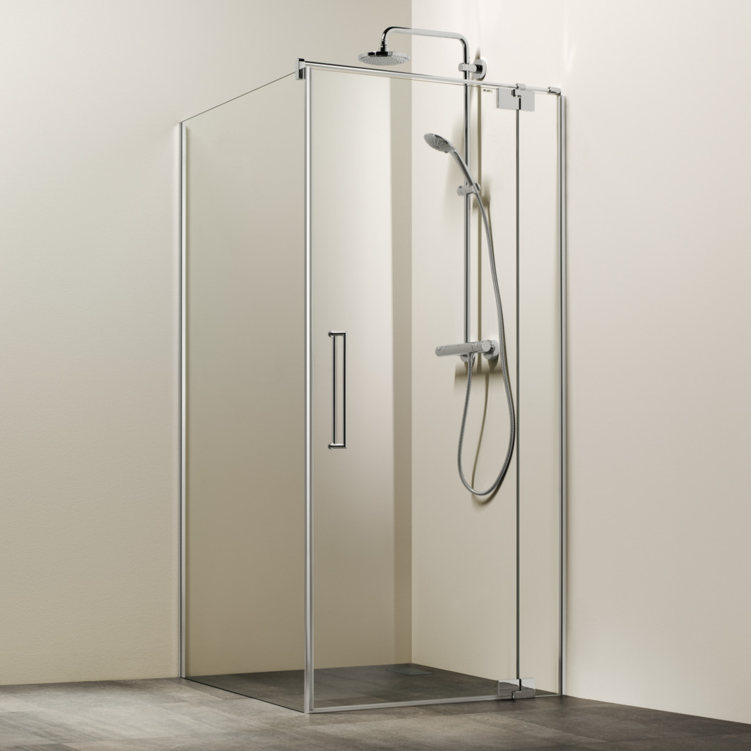 zu Pendeltür 1-teilig, Pendeltür an Fixteil und Falttür 2-teilig (zu Pendeltür 2-teilig nicht möglich), Glas 8 mm, Standardhöhe 200 cm plus 3 cm Rundrohrbügel Ø 1,4 cm, PALM.free, PALM.fix, PALM.pro, PALM.isi-clean, optional PALM.nano, PALM.care, schmales Wandprofil zur Montage auf oder in Fliese, kostenlose Naturmaßabnahme erforderlich