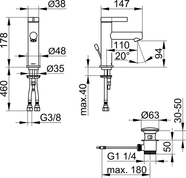 Auslaufhöhe 94 mm, Einlochmontage mit Schnell-Montage-System, Anschlussart Anschlussschläuche G 3/8, Mischwasserkartusche mit keramischen Dichtscheiben, mit Temperaturbegrenzung, Strahlregler M 20 x 1, Strahlwinkel +/-6° verstellbar, Durchflussmenge begrenzt auf 7 l/min, für Durchlauferhitzer geeignet, geräuschgeprüft