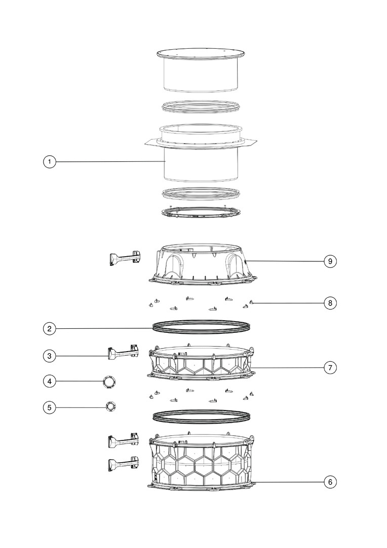 mit Zugang LW 800, zur Kombination mit Rückstau-Technikmodul Ecolift XL, Aquapump XL, aus Kunststoff Polyethylen PE-HD, Einbau in eine Bodenplatte, beständig bei Einbau ins Grundwasser bis 3000 mm, für WU-Beton mit Flansch und Gegenflansch, Schachtringe mit montierten Steighilfen, Konus mit teleskopisch höhenverstellbarem Aufsatzstück, runde Abdeckung, Klasse K 3, alle für die Montage erforderlichen Dichtungen und Verbindungskeile, Auslieferung in Einzelelementen, Abdeckungen tagwasserdicht