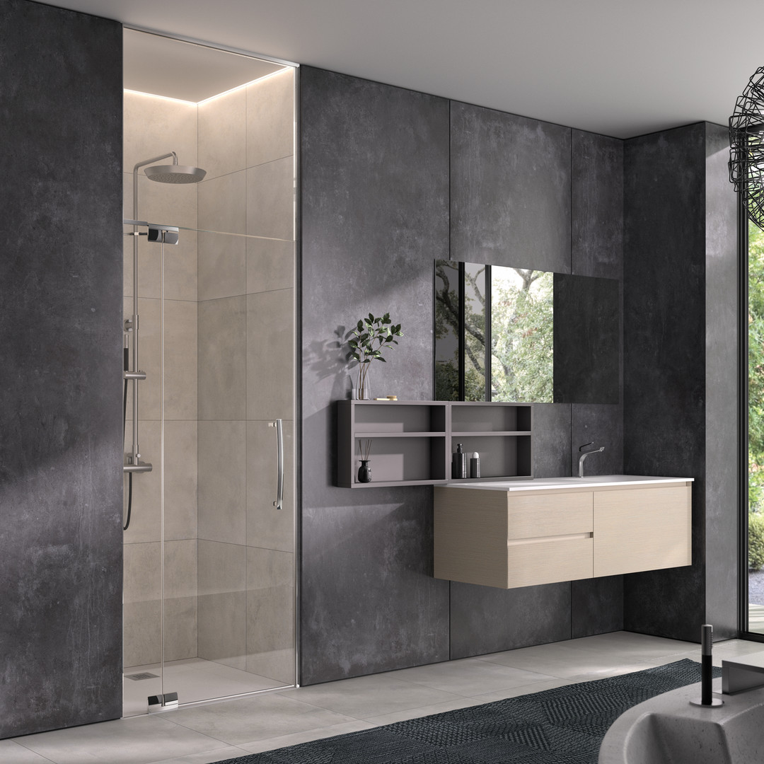 Glas 7,76 mm VSG, Höhe 80 cm, zur Kombination mit einer Nischentür, Pendeltür an Fixteil, Pendeltür mit Fixteil in Verlängerung, Pendeltür mit zwei Fixteilen und Falttür 2-teilig an Fixteil, schmales Wandprofil zur Montage auf Fliese, PALM.pro, PALM.isi-clean, optional PALM.nano, PALM.care, kostenlose Naturmaßabnahme erforderlich