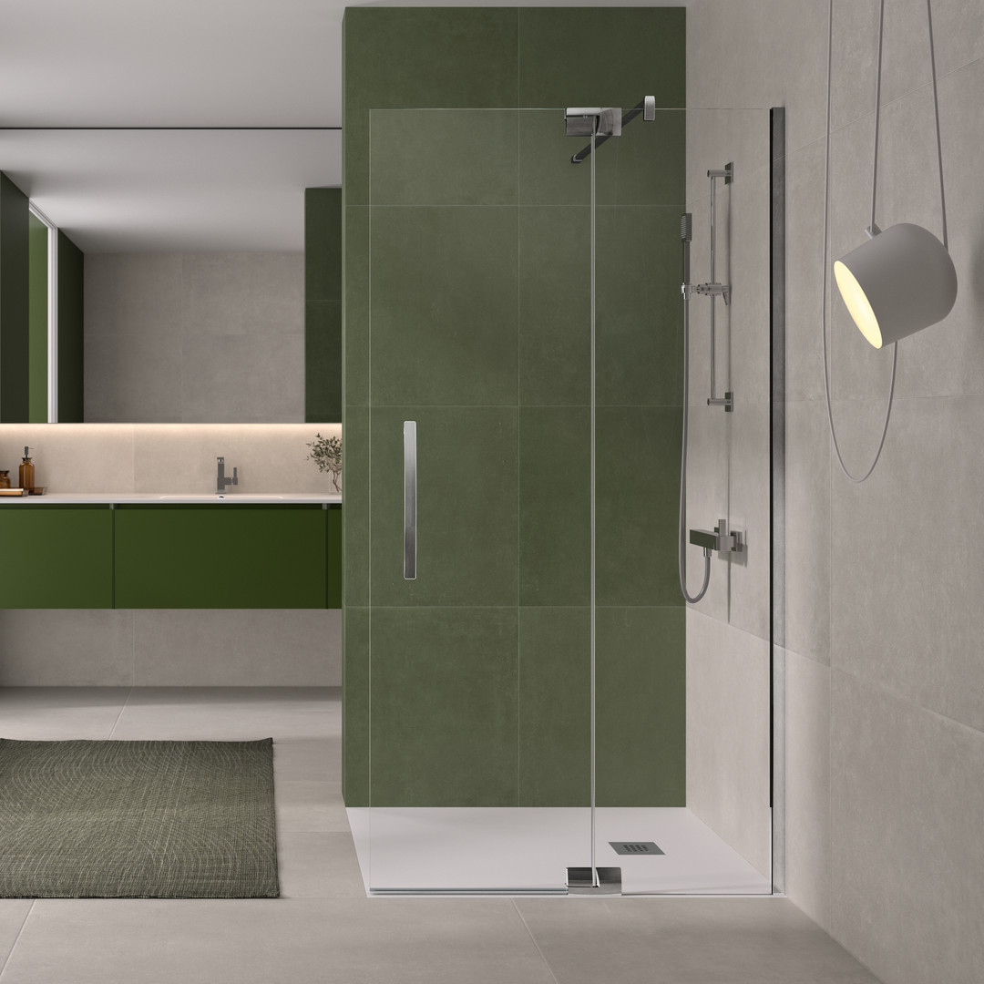 Palme Trennwand WALK In Aprejo Vario mit Pendeltür 138,5 x 200 cm, rechts, AK ESG transparent, cenit-chrom, auf Duschwanne