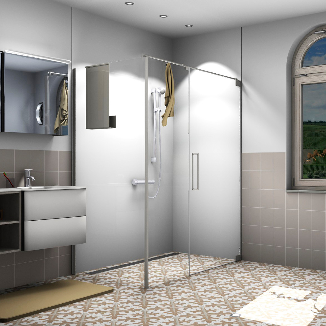 Verwendung mit Seitenteil, Glas 8 mm ESG, Standardhöhe 200 cm plus 3 cm Rundrohrbügel Ø 1,4 cm, Tür öffnet nach Innen und Außen, bodeneben, ohne Schwallschiene, Palm.fix, PALM.lift, PALM.free, PALM.pro, PALM.isi-clean, optional PALM.nano, PALM.care, schmales Wandprofil zur Montage auf oder in Fliese, kostenlose Naturmaßabnahme erforderlich