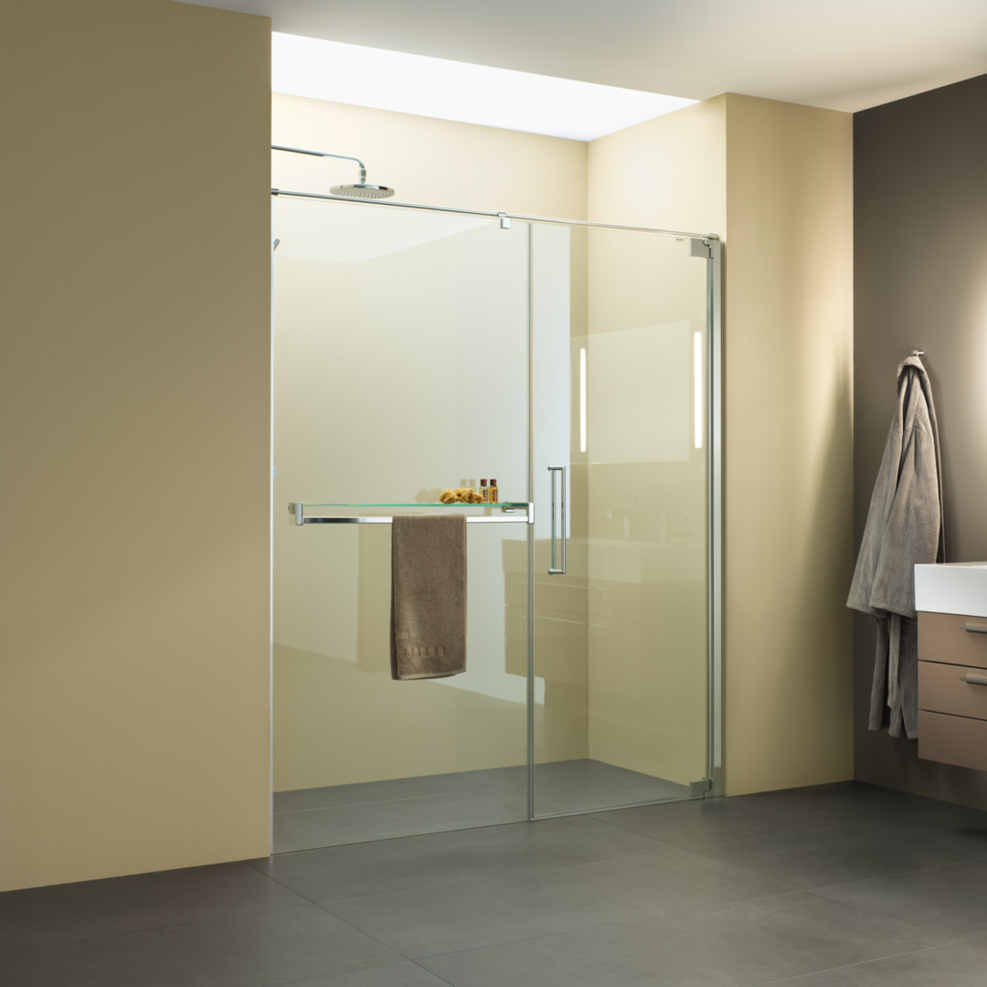 Verwendung mit Seitenteil, Glas 8 mm ESG, Standardhöhe 200 cm plus 3 cm Rundrohrbügel Ø 1,4 cm, Tür öffnet nach Innen und Außen, bodeneben, ohne Schwallschiene, Palm.fix, PALM.lift, PALM.free, PALM.pro, PALM.isi-clean, optional PALM.nano, PALM.care, durchgehendes Wandbefestigungsprofil mit Verstellbereich, kostenlose Naturmaßabnahme erforderlich