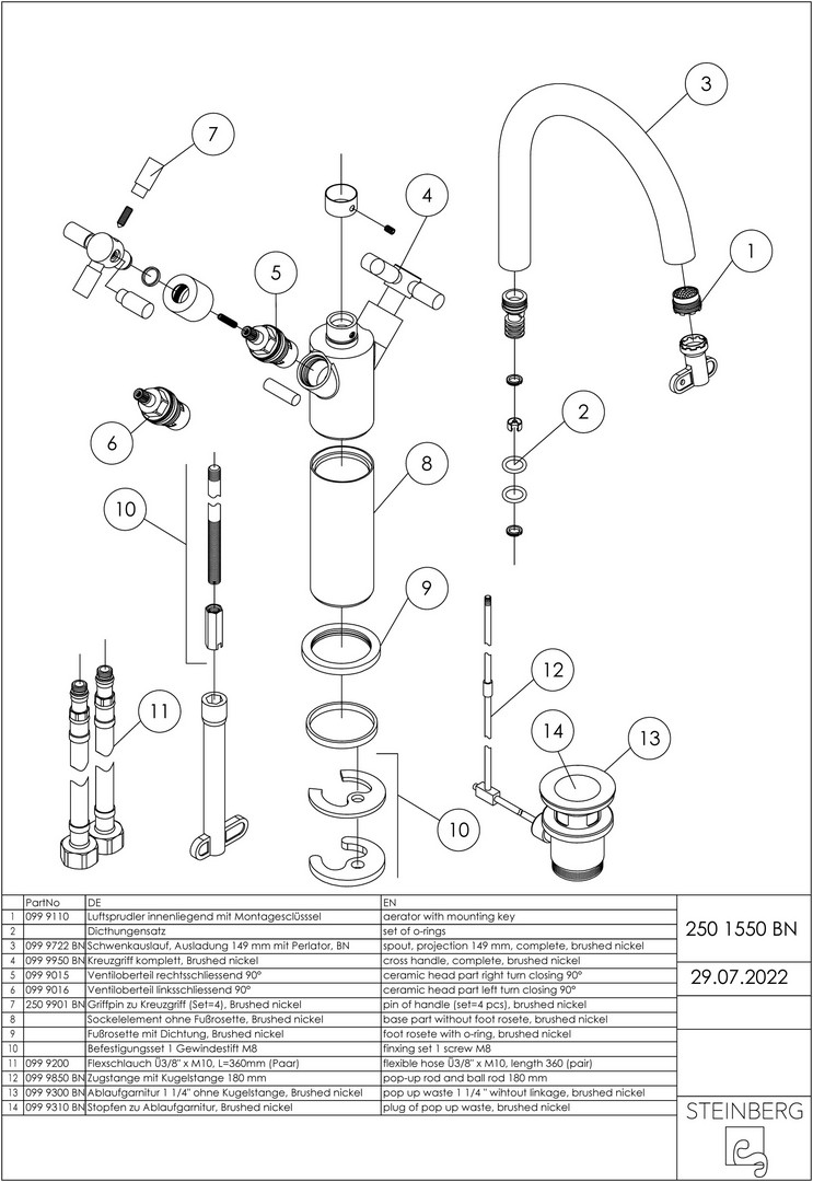 Steinberg Waschtisch-Zweigriffarmatur Serie 250 Ausladung 155mm, schwenkbar, mit Ablaufgarnitur 1 1/4", brushed nickel W323387