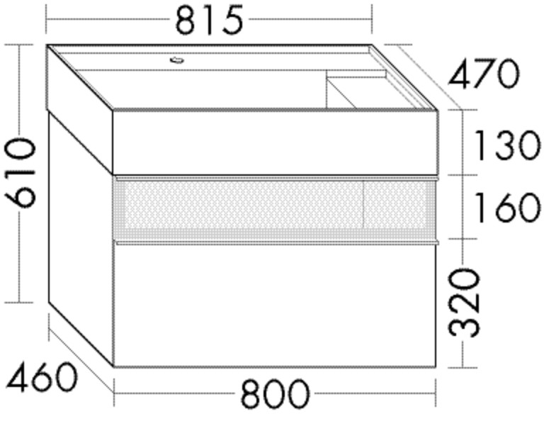 Waschtisch: Muldentiefe 105 mm, Unterschrank: 1 Schublade oben, 300 mm tief, Alurahmenfront mit Rauchglaseinsatz und Siphonausschnitt, 1 Auszug unten, 350 mm tief, mit cleanFlow