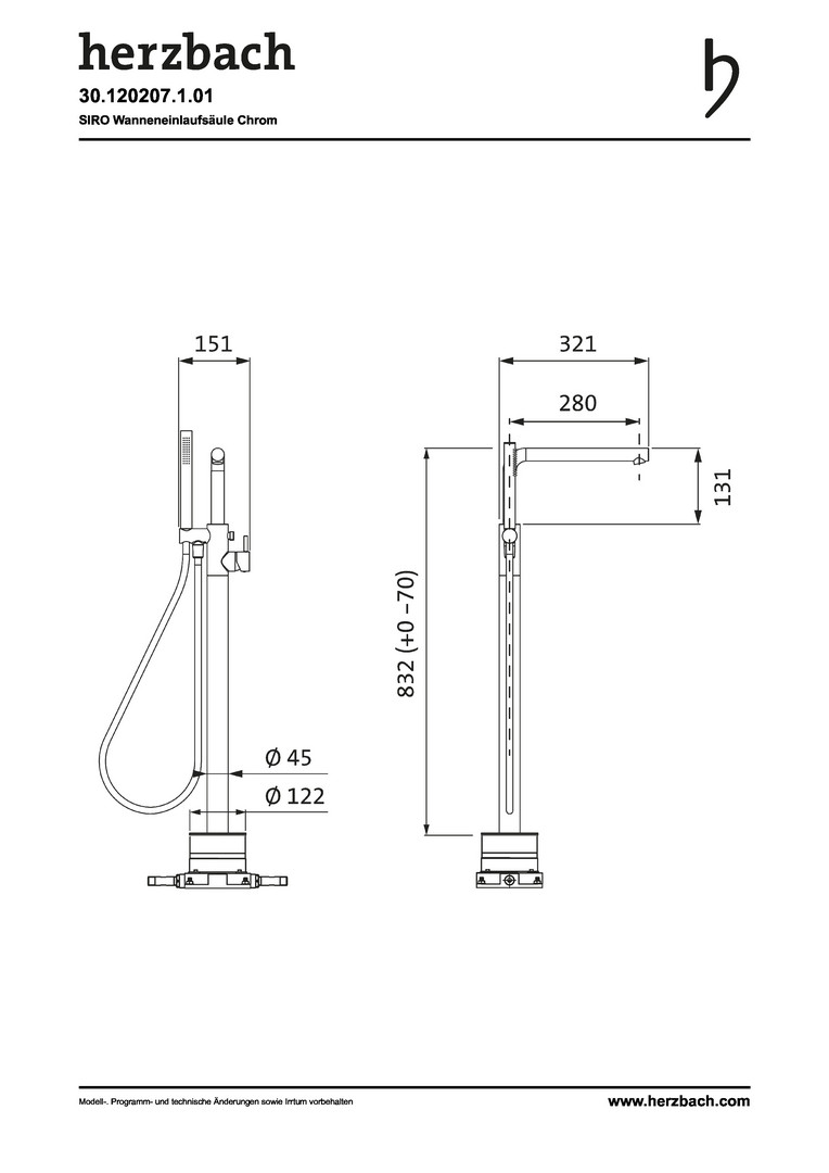 Herzbach Fertigmontageset Siro Wanneneinlaufsäule, bodenstehend, mit Brausegarnitur, chrom