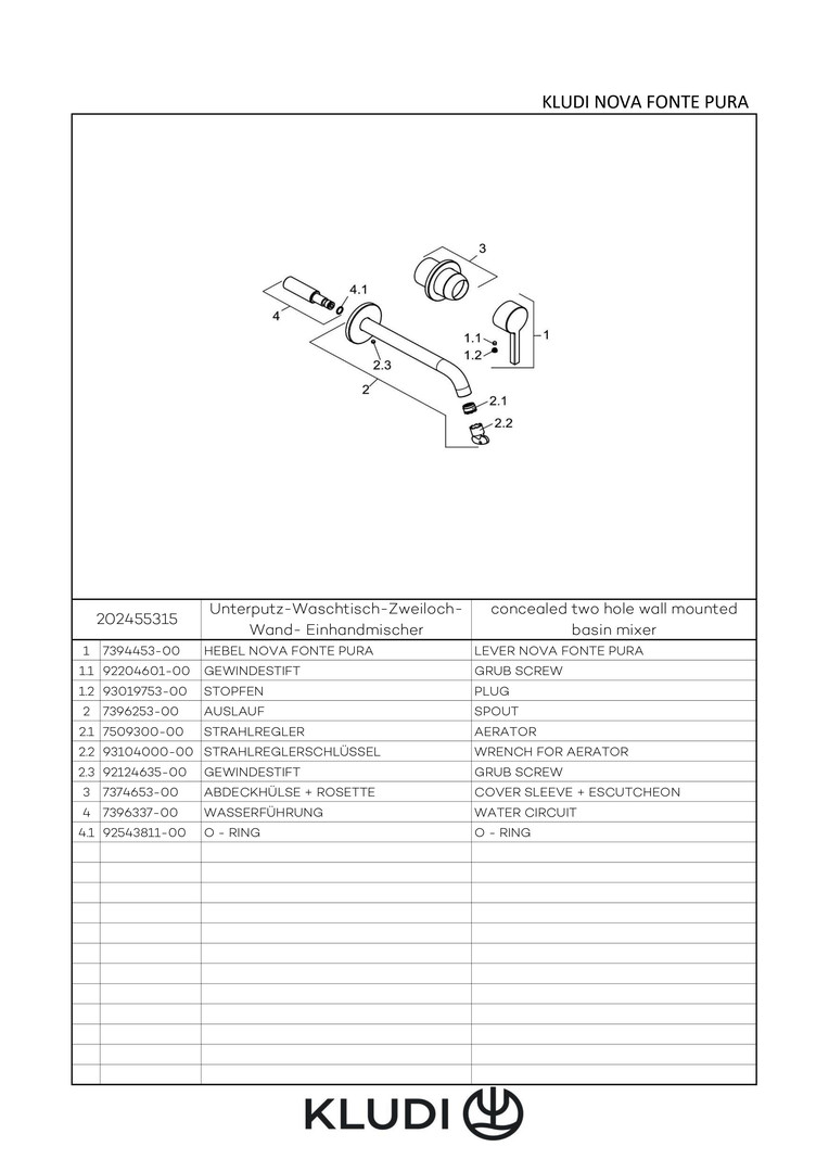 KLUDI Nova Fonte Pura Fertigmontageset UP-Waschtisch-Zweiloch-Wand-Einhebelmischer, Ausladung 220mm, chrom W324509