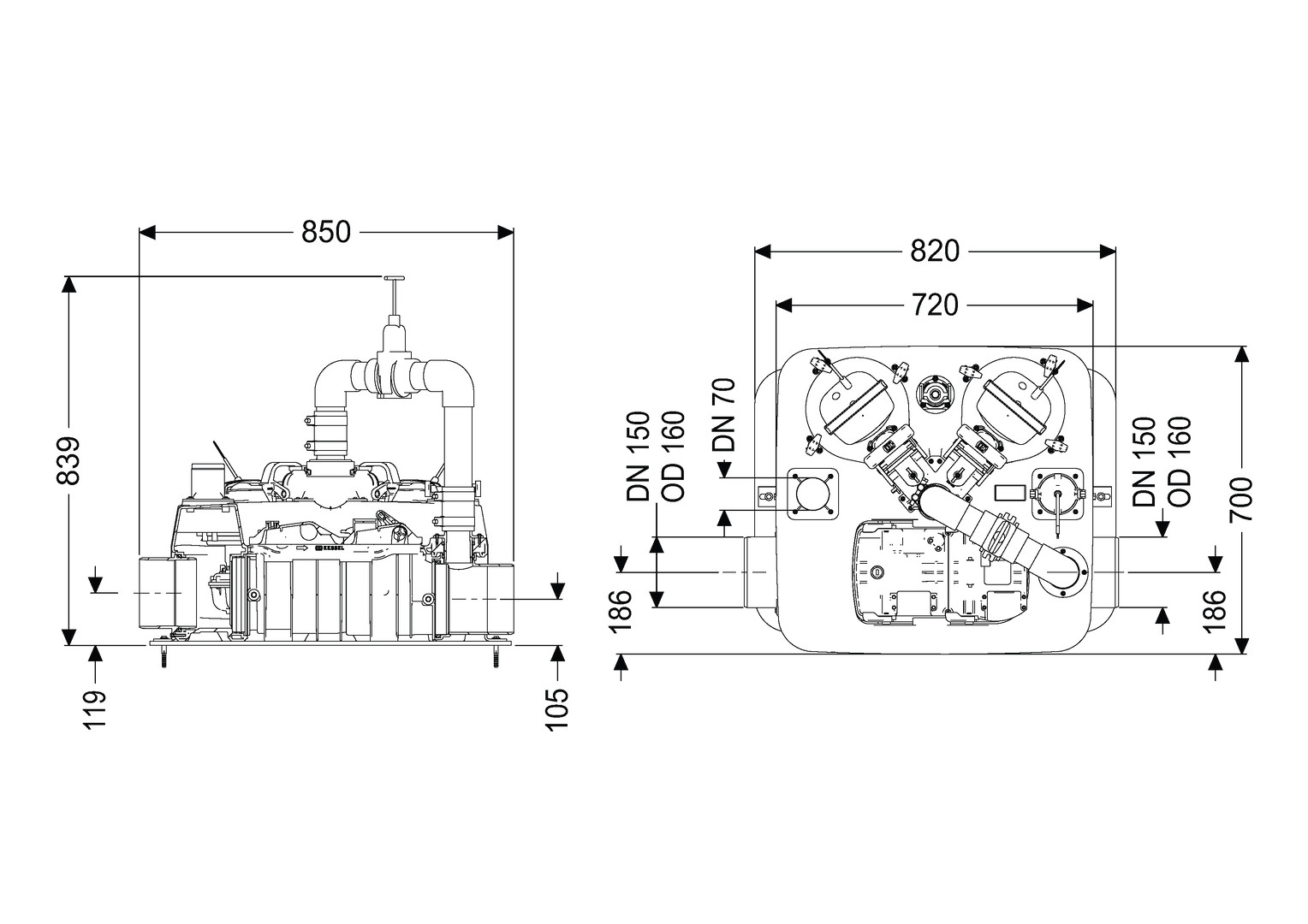 mit integrierter Druckleitung, 850 x 700 mm, 230 V, für Grauwasser, Einbau in eine freiliegende Abwasserleitung in frostgeschützten Räumen, für fäkalienfreies oder fäkalienhaltiges Abwasser, Behälter aus PE, Pumpe mit Freistromrad, Zulauf/Auslauf DN 150/OD 160, Druckabgang DN 50/OD 63, selbsttätiges Verschlusssystem mit handverriegelbarem Notverschluss (FKA motorisch betrieben), Comfort-Schaltgerät mit Selbstdiagnosesystem (SDS) und Displayanzeige der Betriebszustände, Rückflussverhinderer, Absperrschieber für die Druckleitung, Steckerfertig, Netzfrequenz 50 Hz, erforderliche Absicherung (Leitungsschutz) C 16 A, Schutzart Pumpe IP 68 (3 m/48 h), Schutzart Motor IP 68