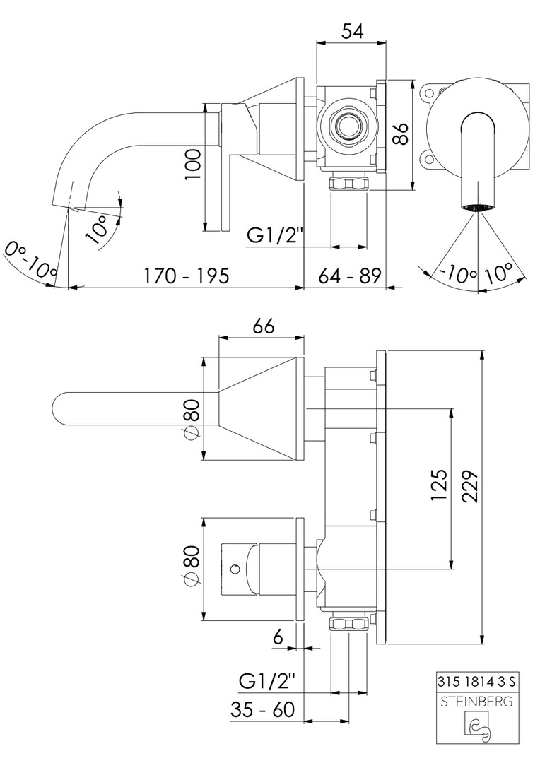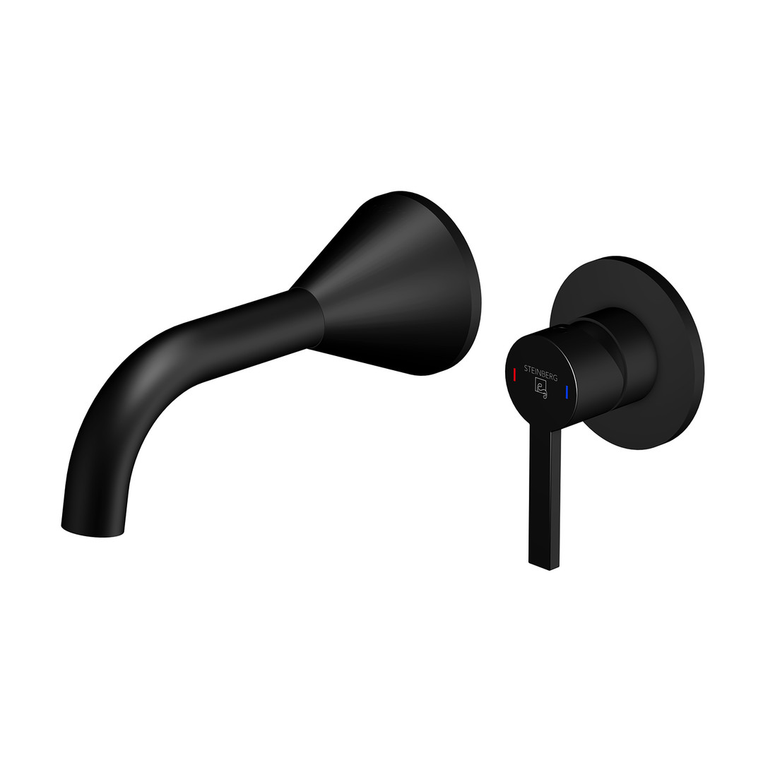 Steinberg Fertigmontageset Wand-Waschtischarmatur, Ausladung 195mm, mit Keramikkartusche, Matt Black