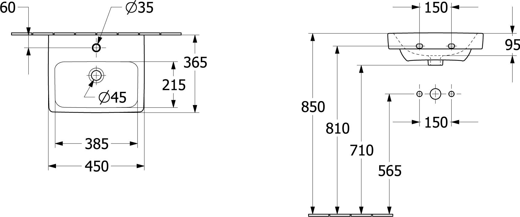 Rechteck, für 1-Loch Armatur geeignet, Hahnloch durchgestochen, keine 3-Loch Armatur möglich, mit oder ohne Überlauf
