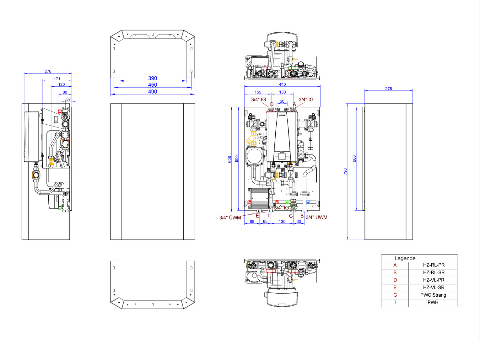 bestehend aus: Heizungsseite: Plattenwärmeübertrager (PWÜ) kupfer- (Cu) oder edelstahlgelötet (VA), Umschaltventil für Trinkwasserbereitung, Wärmezählerpassstück 3/4“ AG flachdichtend (Länge 110 mm), Fühlereinbaustück direktfühlend Ø 5-5,2 mm M10x1 IG (für Fabrikate Ista Sensonic, Allmess V-Lite, Pollux Com E, Techem delta tech, Minol M, Rossweiner, ABB, Entex, Molliné), Schmutzfänger mit Sieb aus Edelstahl Maschenweite Ø 0,5 mm, integriertes Regulierventil im Sekundär-Vorlauf, Zonenventil im Sekundär-Rücklauf, Verrohrungsmaterial Edelstahl 1.4301 (DIN EN 10088), Trinkwasserseite: Plattenwärmeübertrager kupfer- oder edelstahlgelötet, Volumenstromsensor, Verrohrungsmaterial Edelstahl 1.4401 (DIN EN 10088), Durchlauferhitzer, Mischventil, Frischwasserregler: Vorwärmstufe 1 einstellbar, Komfortschaltung für Warmspülen der Heizungsseite,optionales Zubehör: Umrüst-Set Rohrstück mit Rücklauftemperaturbegrenzer und Schmutzfänger für Sekundär-Rücklauf, zusätzliche Kugelhähne im Sekundär-Vor- und Rücklauf und im Trinkwasser warm, Anschluss-Set komplett, Dämmung der Rohrleitung Trinkwasser kalt und Vorlauf Heizung Anschlüsse Heizung, Vorlauf Sekundär - ohne Kugelhahn - 3/4“, ÜW flachdichtend - nach unten, Rücklauf Sekundär - ohne Kugelhahn - 3/4“ ÜW flachdichtend - nach unten, Vorlauf Primär - mit Kugelhahn DN 20, 3/4“ IG - nach oben, Rücklauf Primär - mit Kugelhahn DN 20, 3/4“ IG - nach oben, Trinkwasser, Eingang kalt - mit Kugelhahn DN 20 - 3/4“, IG - nach unten, Ausgang warm - ohne Kugelhahn - 3/4“ ÜW, flachdichtend - nach unten, Technische Daten Primärseite: max. Temperatur 35-45 °C, max. Prüfdruck 6 bar, max. Betriebsdruck 4 bar, Trinkwassererwärmung: max. Entnahmetemperatur 60 °C, max. Prüfdruck 15 bar, max. Betriebsdruck 10 bar, Leistung allgemein: HY1 (50 °C Trinkwarmwasser), GTA1-HY-BY-HT thermische Leistung 14,5 kW (bei 35 °C VL/1100 l/h Volumenstrom) + elektrische Leistung 13,5 kW = 28 kW (Entnahmemenge 10 l/min) - Druckverlust = 680 mbar, GTA2-HY-BY-HT thermische Leistung 18,5 kW (bei 35 °C VL/1100 l/h Volumenstrom) + elektrische Leistung 13,5 kW = 32 kW (Entnahmemenge 11,5 l/min) - Druckverlust = 790 mbar, HY2 (50 °C Trinkwarmwasser), GTA1-HY-BY-HT thermische Leistung 17 kW (bei 35 °C VL/1100 l/h Volumenstrom) + elektrische Leistung 21 kW = 37,7 kW (Entnahmemenge 13,5 l/min) - Druckverlust = 1300 mbar, GTA2-HY-BY-HT thermische Leistung 23,7 kW (bei 35 °C VL/1100 l/h Volumenstrom) + elektrische Leistung 21 kW = 44,7 kW (Entnahmemenge 16 l/min) - Druckverlust = 1775 mbar