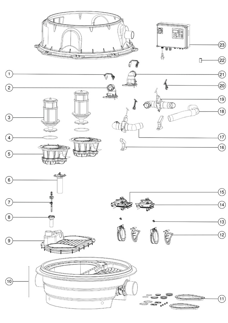Trockenaufstellung, Variante für niedrigsten Einbau, für fäkalienhaltiges Abwasser, Bodenteil aus PE, für Einbau in frostgeschützten Räumen (frei aufgestellt) oder in Kombination mit Aufsatzstück LW 800 zum Einbau ins Erdreich oder in eine Bodenplatte, beständig bei Einbau ins Grundwasser bis 3000 mm, die Druckleitung ist als geschweißtes PE-Rohr, bei Pumpe SPF 4500 zusätzlich in einem Druckentspannungsschacht auszuführen, Rückstauhebeanlage Ecolift XL Duo mit aufgeschweißtem Konus LW 800, Zulauf/Auslauf DN 150, mit Comfort Plus-Schaltgerät, mit zwei mechanischen Klappen für Grauwasser, 230 V-Versionen steckerfertig, Kabellänge 10 m