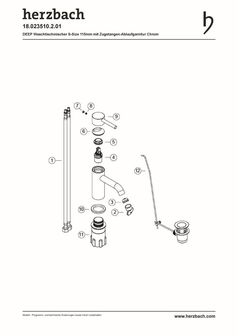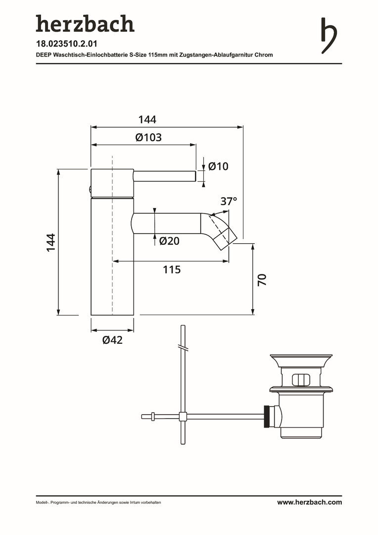Herzbach Waschtisch-Einhebelmischer Deep S-Size, chrom, 115 mm, Zugstangen-Ablaufgarnitur W334664